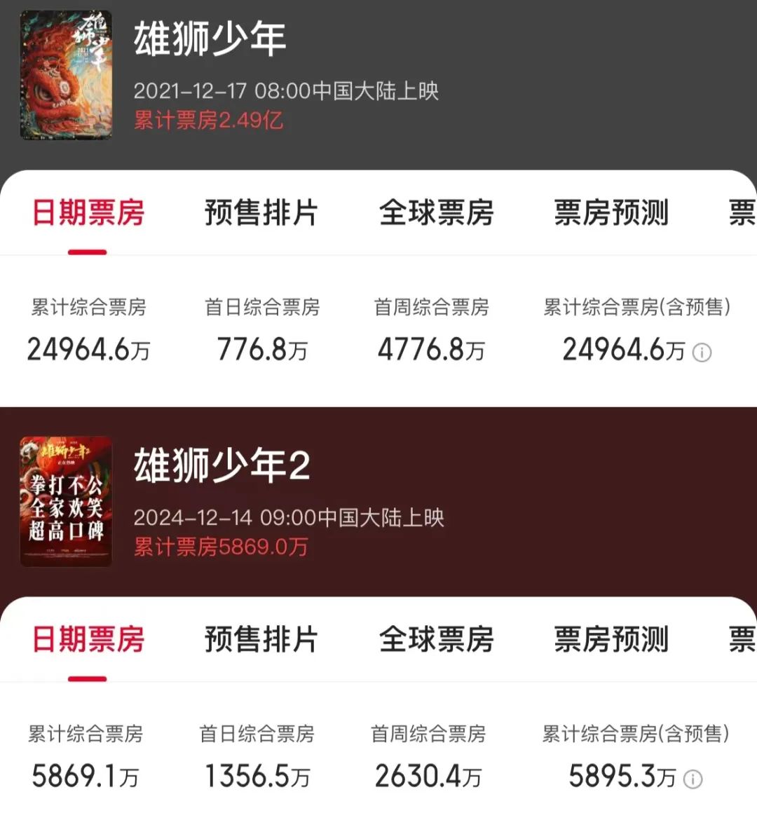 从评分来看,《雄狮少年2》豆瓣开分8.3,与前作平行。不到一周,评分涨至8.4,超过前作,但票房表现却连前作的一半都不到。