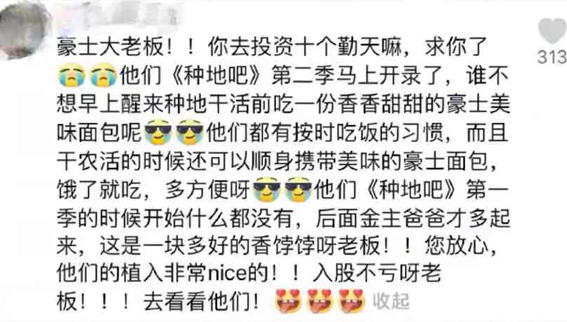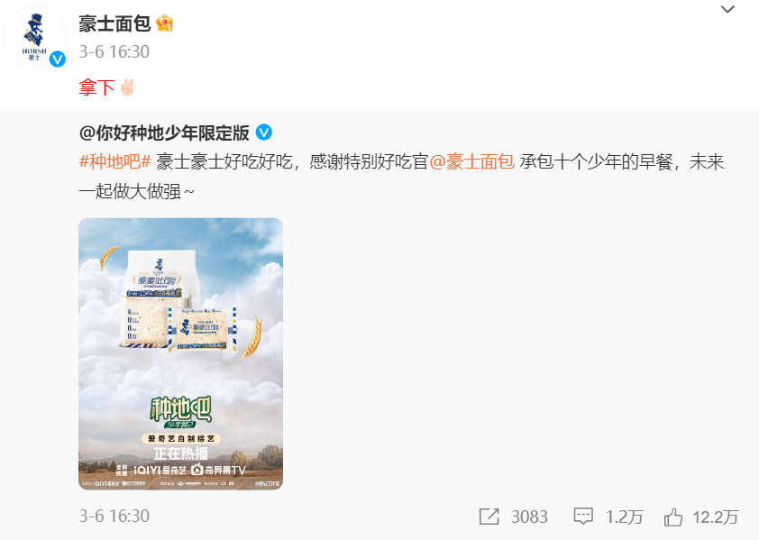 当一部剧综成为热门话题时,品牌需要快速做出反应,可以通过实时参与讨论、发起互动活动,鼓励用户分享或创作相关内容,形成病毒式传播。例如,在《种地吧》播出期间,粉丝们注意到节目中频繁出现豪士面包,于是纷纷前往品牌官博留言促成合作。