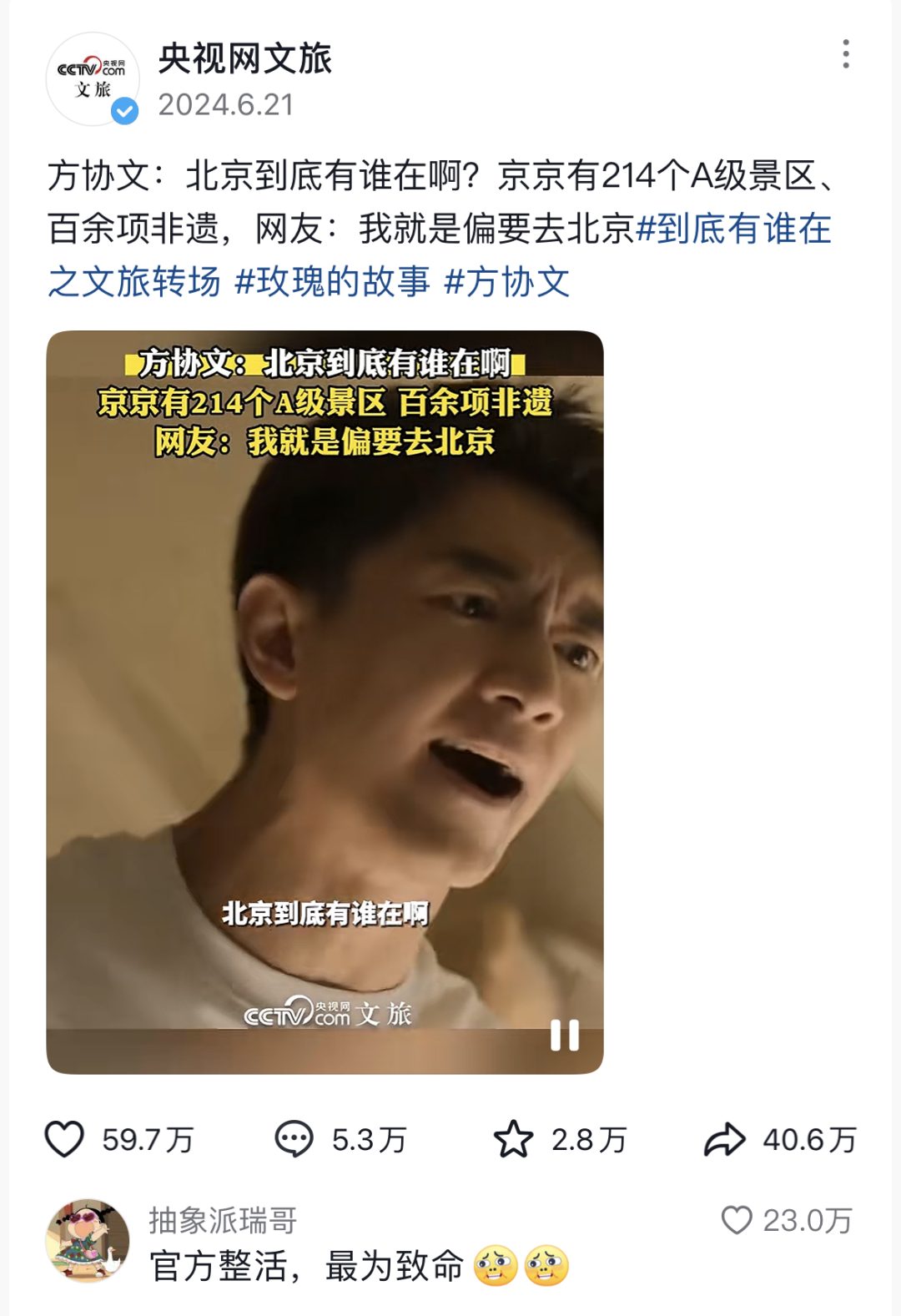 明星效应无疑是品牌宣传的一大利器,品牌可以借助剧综走红的艺人的影响力,通过合作、代言等方式产出新的梗。林更新在《玫瑰的故事》中饰演的角色「方协文」因为一句“北京到底有谁在啊!”而爆火,各地文旅紧抓热梗进行创意宣传,展示旅游特色。
