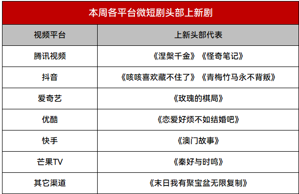 本周短视频平台上新:抖音头部作品上新中,有《咳咳喜欢藏不住了》《青梅竹马永不背叛》《改修无情道后师兄们哭着求原谅》3部;快手头部露出中,有《澳门故事》1部。