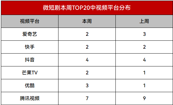 本周登上榜单前20名的剧目中,腾讯视频占据7部,抖音占4部,优酷3部,爱奇艺、快手、芒果TV各2部。本周腾讯视频优势微降但依旧是第一梯队;抖音、优酷属中间梯队;爱奇艺、快手、芒果TV的优势较少。