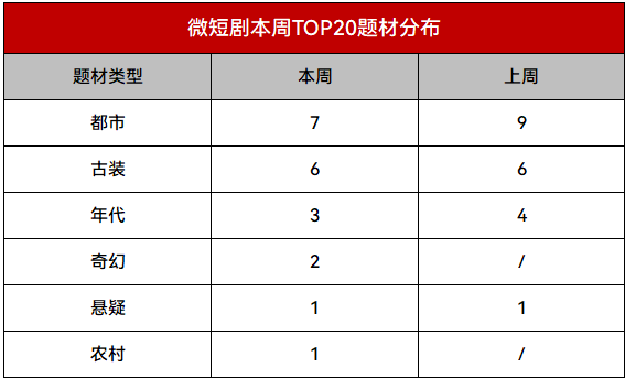 本周登上榜单前20名中,都市剧7部,古装剧6部,年代剧3部,奇幻剧2部,悬疑剧、农村剧各1部。本周,都市剧微量下降;古装剧保持稳定;年代剧紧随其后,奇幻剧、悬疑剧、农村剧等小众类型皆在榜。