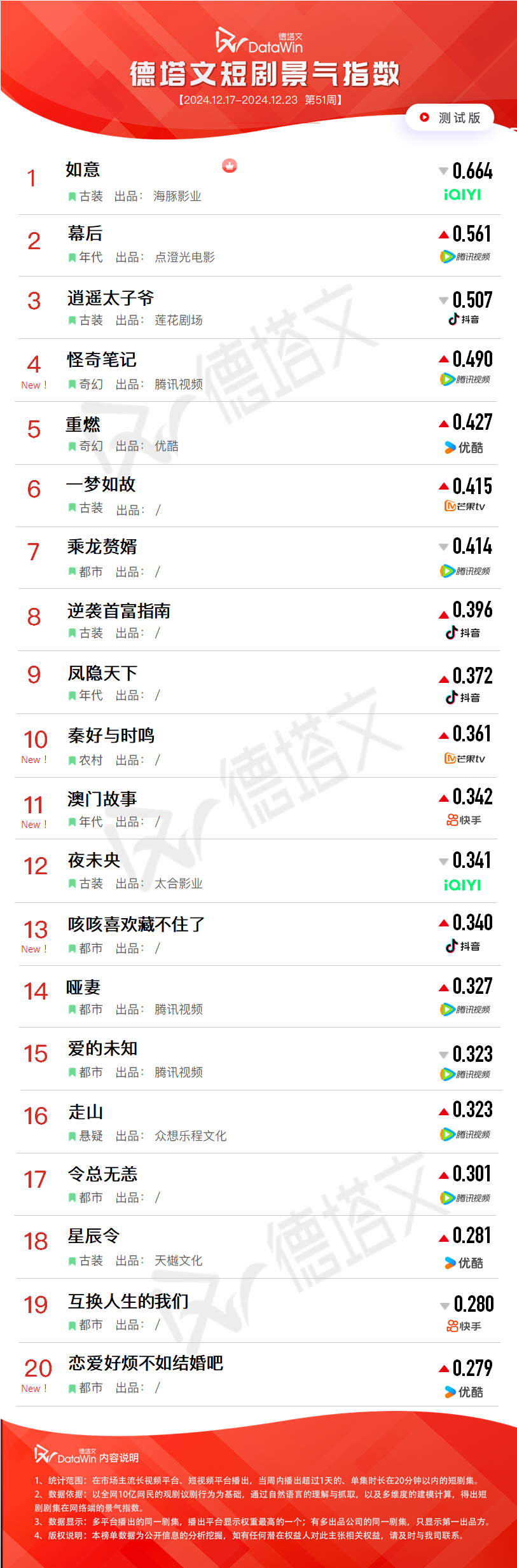 4、数据覆盖首次上星的电视剧和首次播出的网剧。