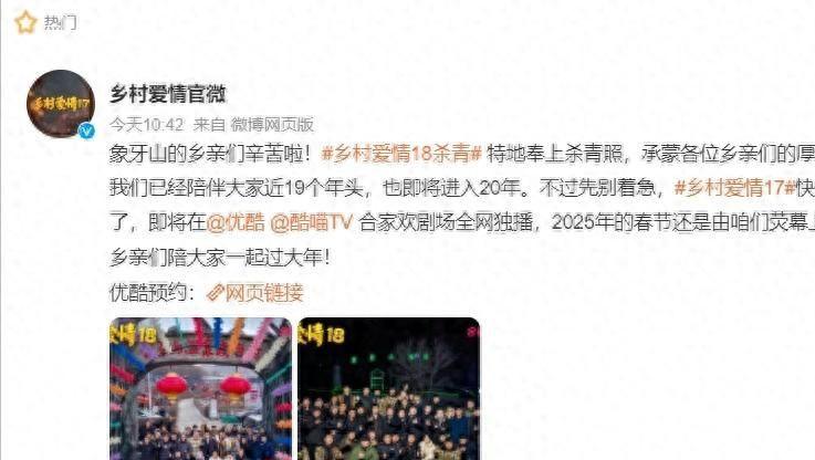 12月22日,“乡村爱情”官方平台传来一则重磅消息:《乡村爱情18》已经顺利完成拍摄,正式杀青。