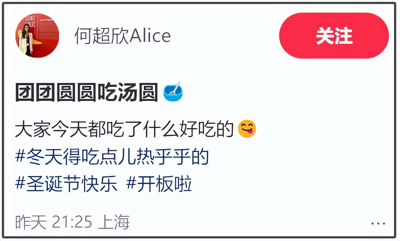 何超欣配文“团团圆圆吃汤圆”,并晒出多张和哥哥何猷君,以及朋友们的合照,但看起来并不是在圣诞当天拍摄,像是朋友聚会。