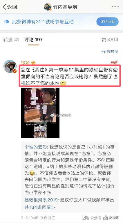 徐娇指出,竹内亮在《我住在这里的理由》里面有一段猥琐且带有恋童倾向。
