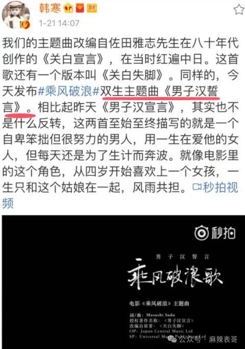 一天后,韩寒说电影还有一首主题曲《男子汉誓言》。