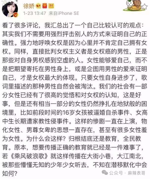 当韩寒的《乘风破浪》主题曲被质疑后,徐娇表达出了明确的态度。