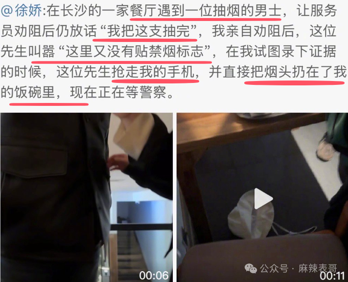 她说自己在长沙餐厅吃饭,遇到一位抽烟男士,劝阻后,男士叫嚣起来,并且抢走了她的手机,还把烟头扔她碗里。