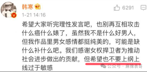 除了歌词,韩寒本身在男女观念方面,口碑就很差。