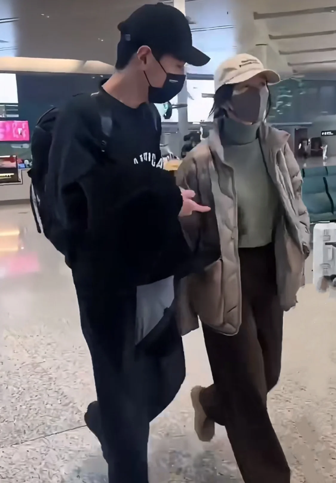 高圆圆和老公赵又廷一身穿着休闲服饰,黑色外套搭配同色长裤,身后背着双肩包,里面应该装着女儿所需要的用品。