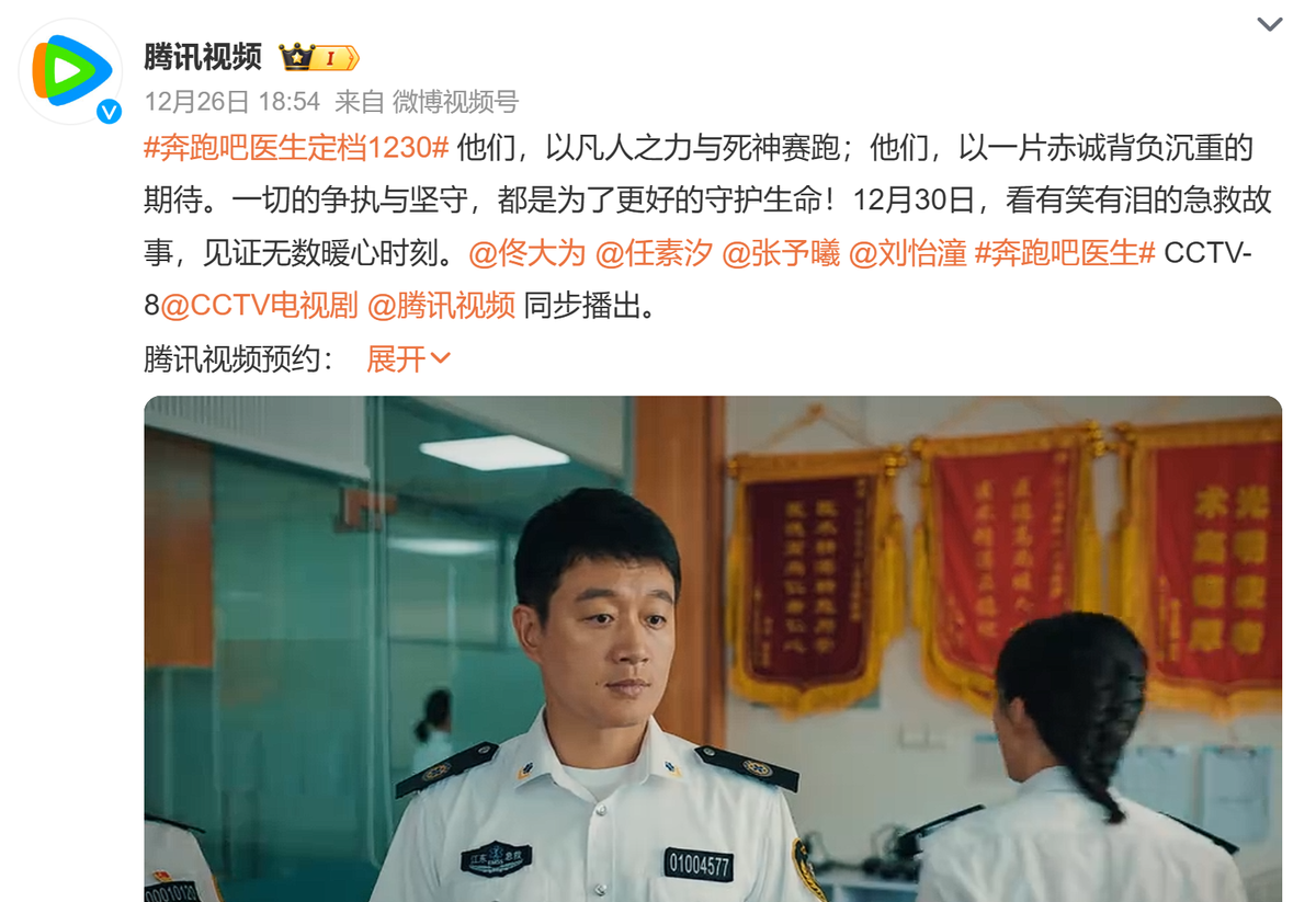 《奔跑吧医生》将于12月30日在CCTV8黄金档播出,鹅厂、桃厂同步网播。