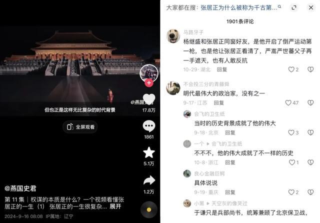 前阵子,他用一条123分钟的视频将“千古一相”张居正经历权力博弈,励精图治推行改革,最后过劳而死的人生细节呈现在观众眼前。评论区中,有人感慨,“历史书上的短短一句话,便是他们波澜壮阔的一生。”