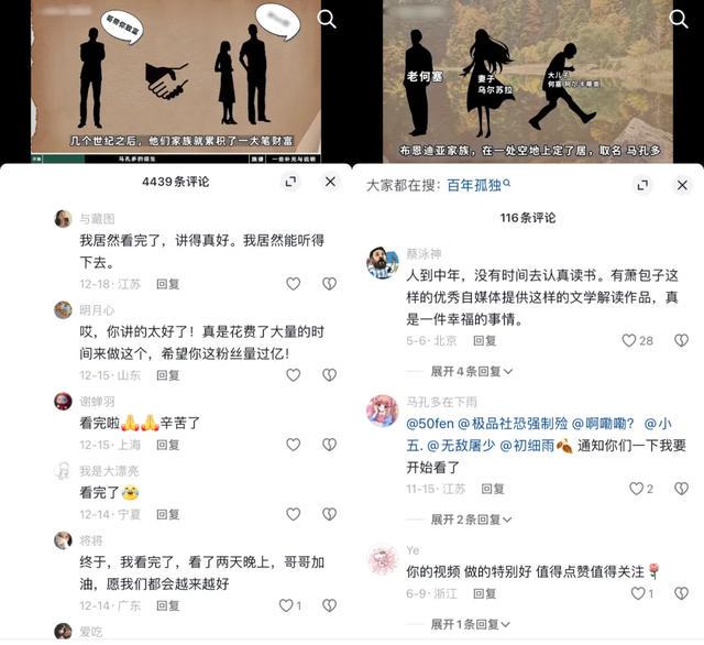 那段艰难的日子里,唯有书籍,如同一束坚定的光,照亮他的内心。2024年,萧包子成了一名抖音知识类创作者,制作了多部超长视频解读经典文学,包括228分钟的《百年孤独》,155分钟的《基督山伯爵》,以及160分钟的《霍乱时期的爱情》。