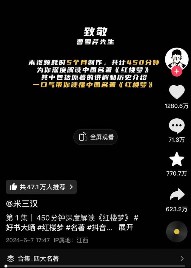 风暴之下,原本隐匿于角落、默默耕耘的创作者们纷纷崭露头角。6月,米三汉发布了一条“450分钟深度解读《红楼梦》”的视频,5天内就收获了1.3亿播放量,成为现象级爆款。