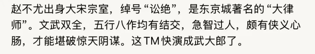 这放在现代基层小人物上没问题,但赵不尤是京城著名的“大律师”,文武双全、才智过人,不应该有这些窝囊废似的举动。
