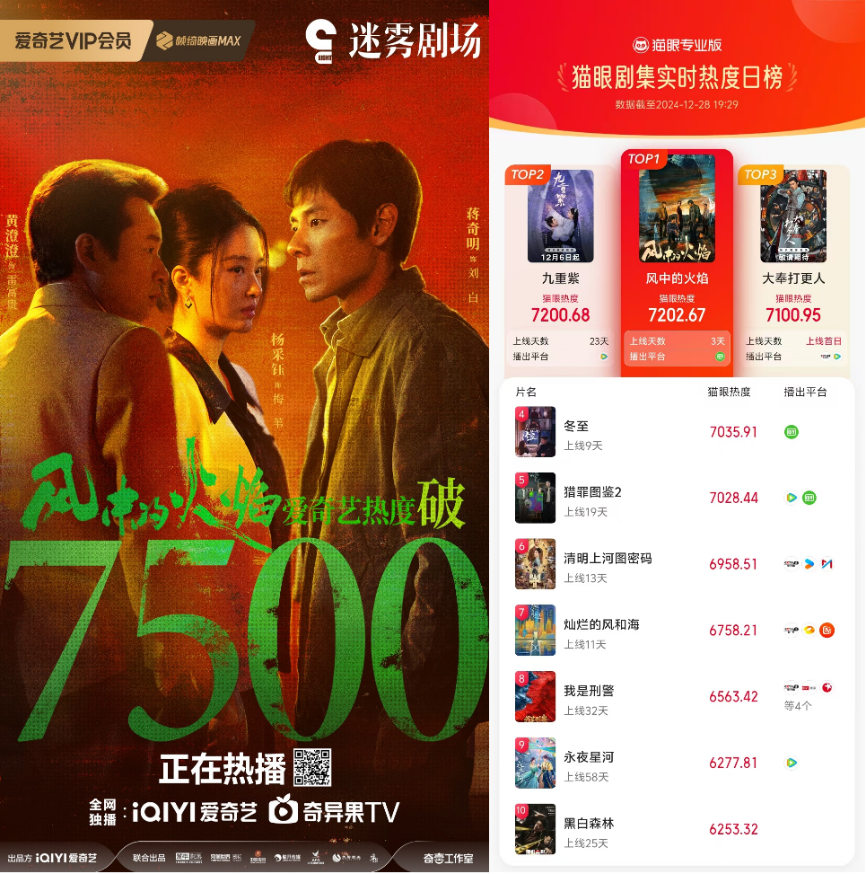 短短时间,《风中的火焰》便因烧脑刺激、反转不断的剧情,稀缺性的西北悬疑风格,和一众实力派演员的硬核演技,在爱奇艺站内的热度值迅速突破7500,并斩获猫眼剧集实时热度日榜第一的成绩。