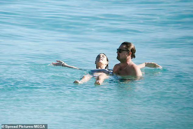 现年50岁的小李子在海中展示了他的“男友力”,帮助维托利亚享受漂浮在海中的乐趣,看样子两个人配合得很默契。