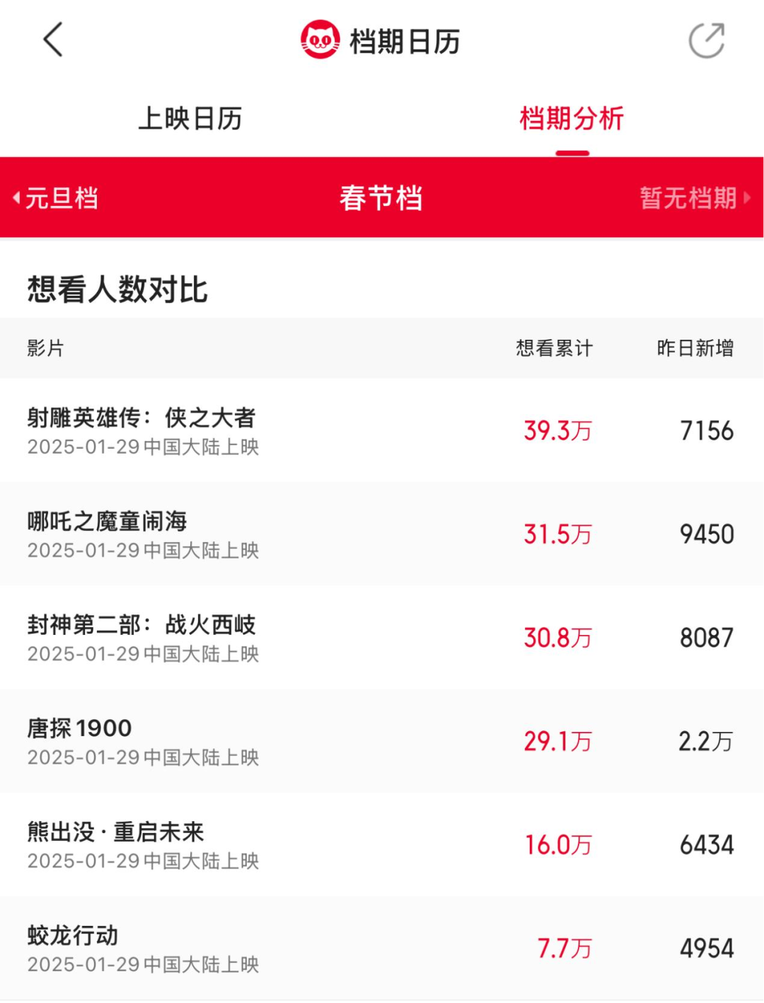 除《无名之辈2》,《蛟龙行动》《唐探1900》《哪吒之魔童闹海》《射雕英雄传:侠之大者》《封神第二部:战火西岐》《熊出没·重启未来》,都已经正式落座2025春节档。