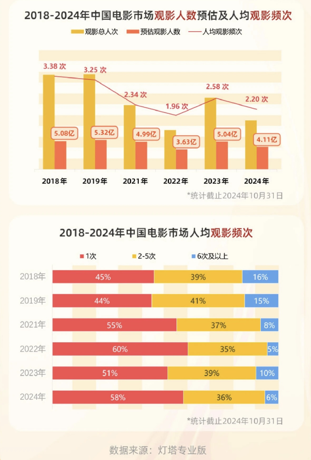与之呼应,中国电影家协会联合灯塔研究院发布的《2024中国电影观众变化趋势报告》显示,截止今年10月,24年电影市场观影人数预估4.11亿,人均观影频次2.20次,近6成(占比58%)观众年均影院观影1次,而这两项数据在2023年分别是5.05亿、2.58次。