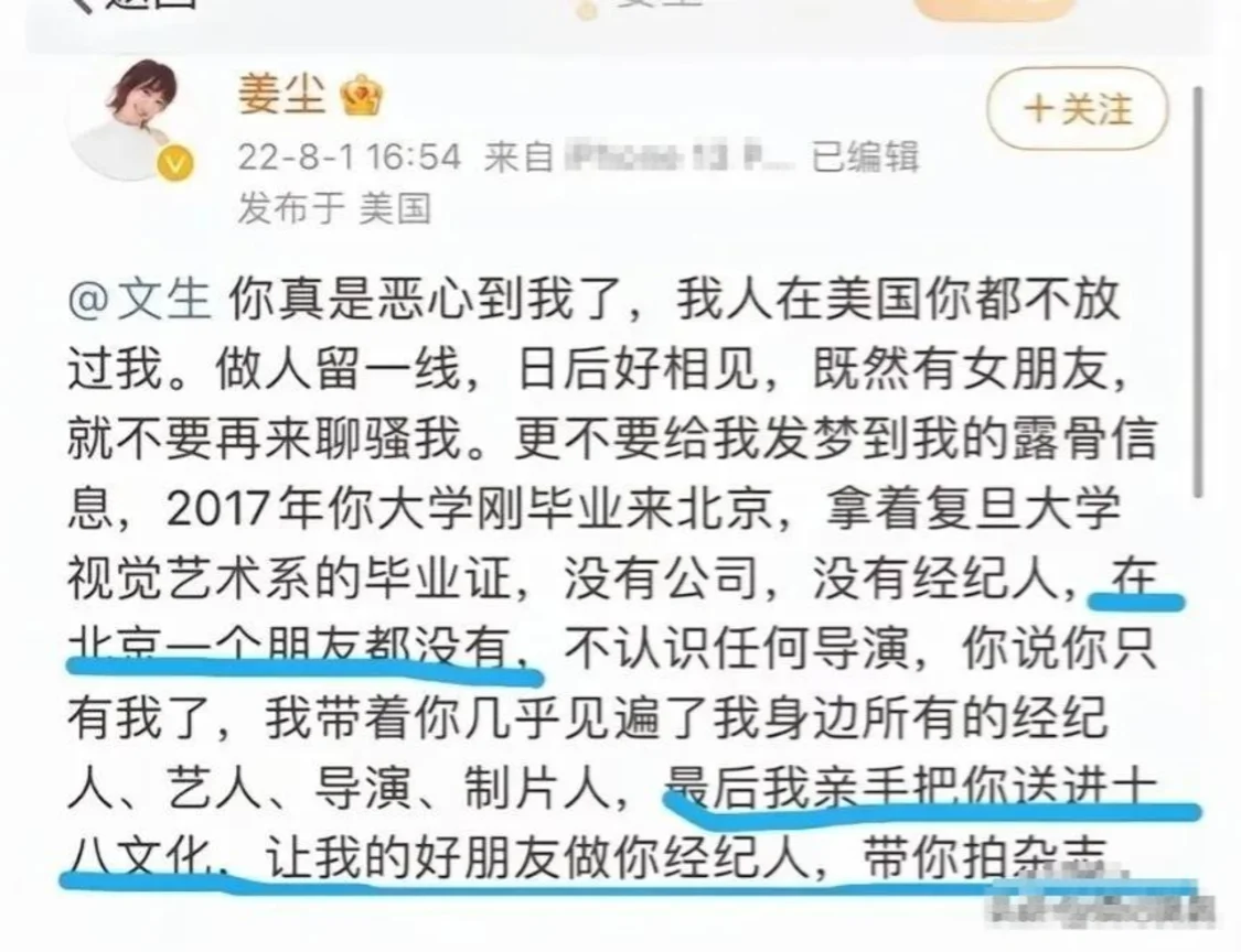 不过,也有网友扒出了姜尘2年前的动态,当时姜尘发文怒斥前男友骚扰,还公开安特了演员文生。