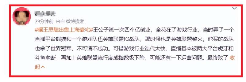 很多网友对王思聪紧急抛售上海豪宅一事议论纷纷,有人说王思聪的日子大不如前,财富缩水严重,但潇洒日子过惯了,急于变现亦在情理之中。当然了,王思聪也并非只是一个贪图享乐的富二代,他也曾自己创业过,比如游戏行业、直播平台等等,虽说后来都失败了,但至少亏得不多。