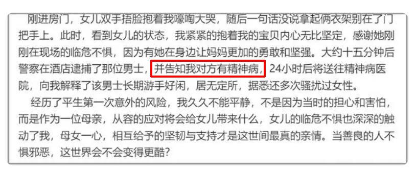 随后,森林北火速拨打了110,16分钟后酒店负责人和警察赶到,这才化解了危机。回到房间后的女儿,内心瞬间破防抱着森林北嚎啕大哭起来。警方很快逮捕了男子,并告诉森林北对方有精神病,24小时后会送往精神病医院。