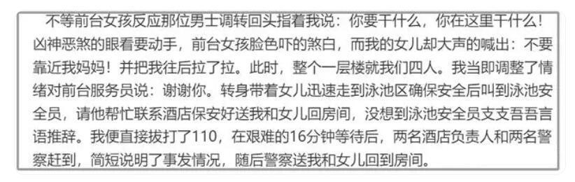 此刻的森林北早已没有了游泳的兴致,她返回泳池前台的服务员,称尽快联系酒店保安或值班经理。没想到这位陌生男子居然也调转了回来,并用手指着森林北大声呵斥道:“你要干什么?你在这里干什么?”男子态度非常恶劣,甚至要对森林北动手。前台女孩被这一场景吓懵了,反倒森林北的女儿大声呼喊:“不要靠近我妈妈!”