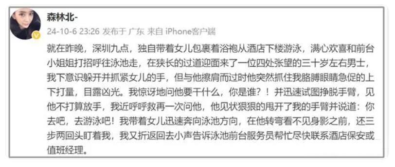 事情是发生在10月5日晚间,地点是深圳某酒店内。和很多家长一样,趁着孩子放长假,森林北带着女儿(和前夫所生)外出游玩。母女俩在晚上9点多,准备去酒店的泳池游泳。正当母女俩兴致勃勃走向泳池时,迎面走来了一位三十岁上下的男子,待双方交汇时,该男子突然一把抓住了森林北的手臂,露出恶狠狠的眼光上下打量着森林北。