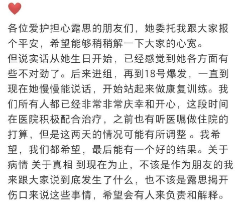 这位朋友还表示:关于病情,关于真相,不该是作为朋友的我来跟大家说到底发生了什么,也不该是露思揭开伤口来说这件事情,希望会有人来负责和解释。