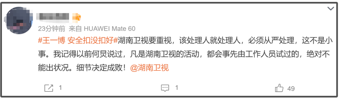 不少网友看到王一博的舞台事故,要求湖南卫视严肃处理相关责任人,责令相关工作人员严格把关,不要再出现雷同状况。