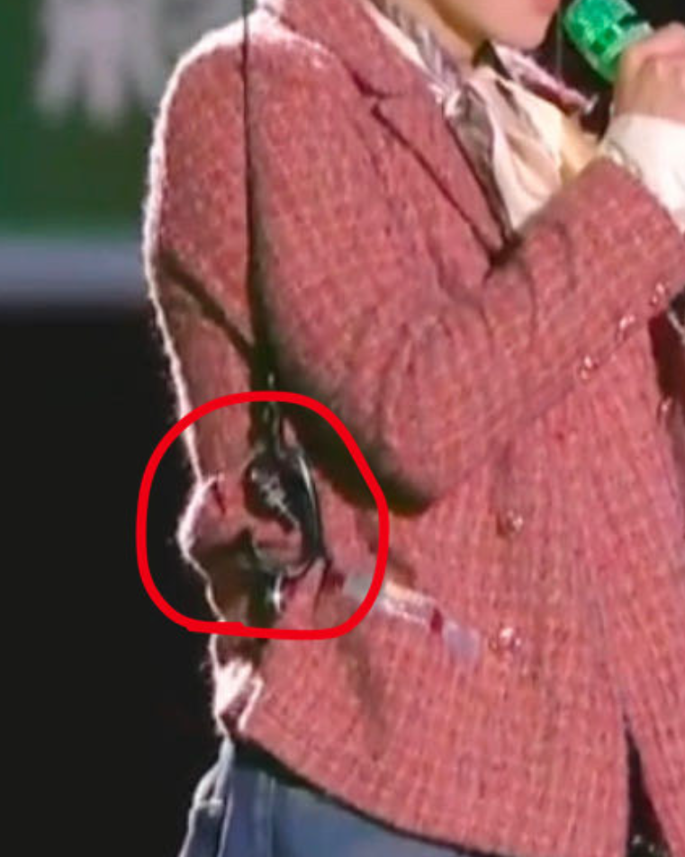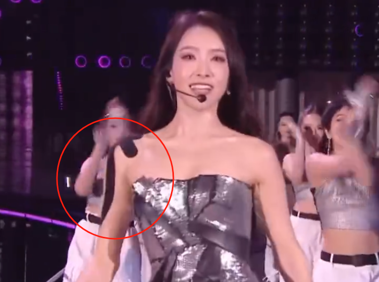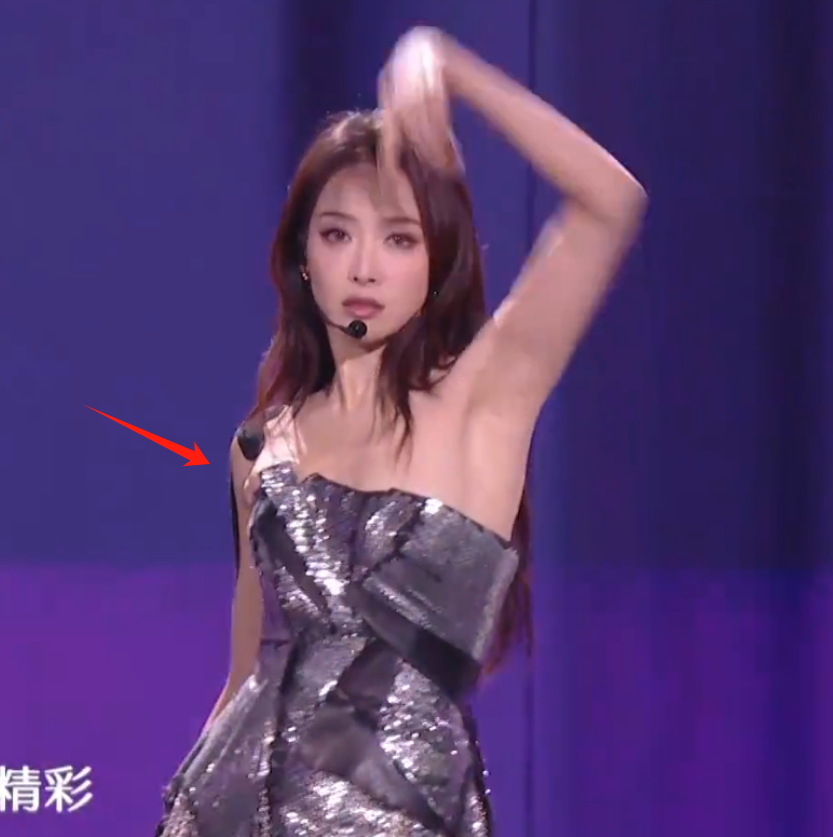 另外一位女歌手宋茜带来的《一个人的精彩》舞台是唱跳舞台,全程需要腿部、肩部、手部有不同幅度的大动作。在表演过程中,会发现宋茜的右手臂没有完全抬起来,而且右手臂上贴有大面积的黑色胶带,乍一看以为是服装造型装饰。