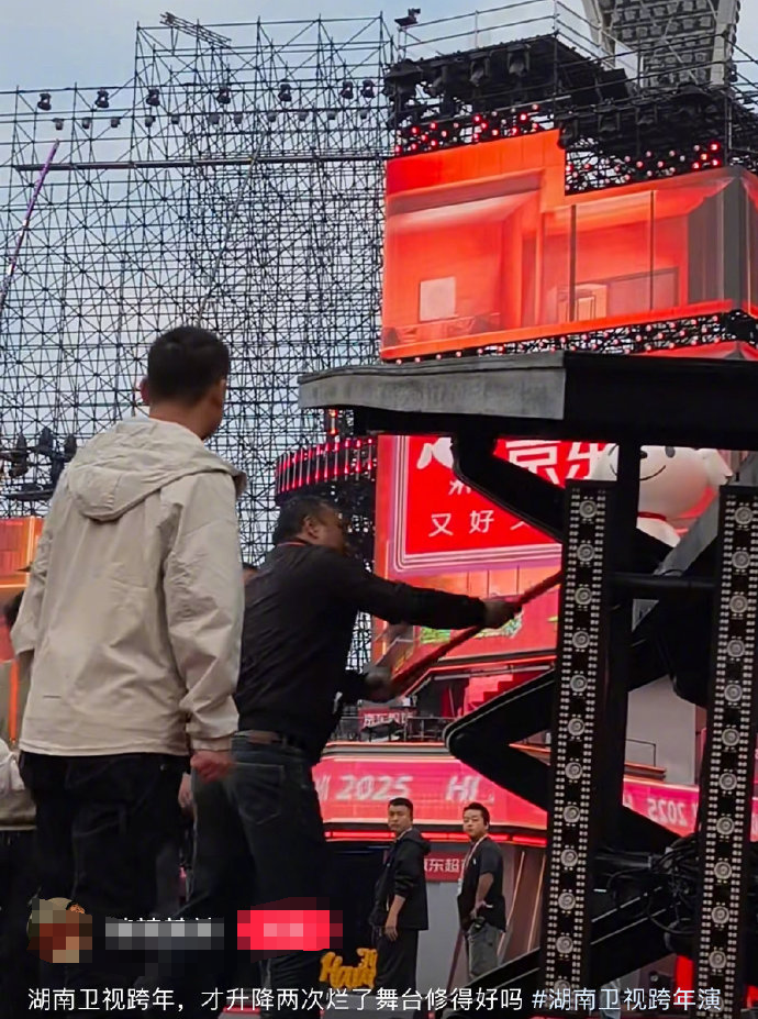 另外,在湖南卫视跨年夜晚会直播前几个小时,有网友爆料称升降舞台出了状况,才升降了两次就有问题,现场的工作人员拿着锤子进行修理。