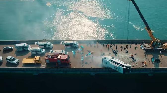 孕妇位于车头,随时可能和大巴一起掉入大海
