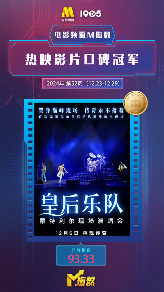 电影频道M指数2024年第52周结果新鲜发布。12月23日-12月29日,电影频道M指数热映影片口碑榜前6位依次为: