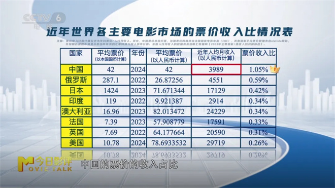环顾世界,美国今年的票价为10.78美元,换算成人民币是78元,比我国略高,但是如果除以平均人均月收入的话,中国的票价收入比是遥遥领先的,接近美国的4倍。
