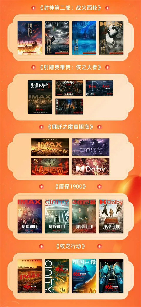 根据发行版本信息显示,《封神第二部:战火西岐》《蛟龙行动》《射雕英雄传:侠之大者》《唐探1900》《哪吒之魔童闹海》5部影片将上映IMAX、CINITY、中国巨幕、杜比视界等全制式,《熊出没重启未来》也将推出CINITY、中国巨幕两类特效制式上映。