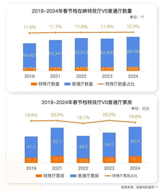 据拓普数据统计,2023年春节档特效厅票房占比为20.2%,是迄今最好成绩;2024年春节档特效厅的数量占比,也创下新高。另外,2024年特效厅票房前两名为《飞驰人生2》和《热辣滚烫》,皆为春节档影片。