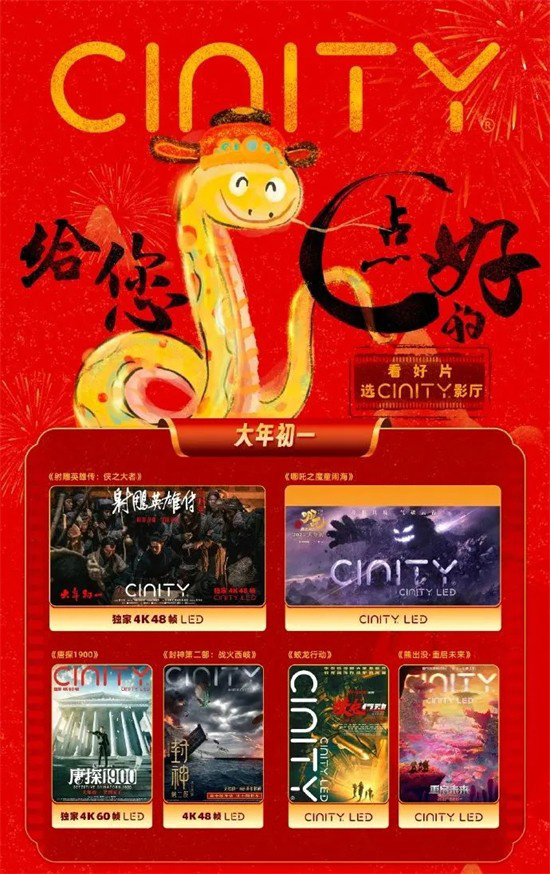 CINITY电影放映系统融合了4K、3D、高亮度、高帧率、高动态范围、广色域、沉浸式声音七大高新技术。今年春节档6部影片也都推出了CINITY版本。