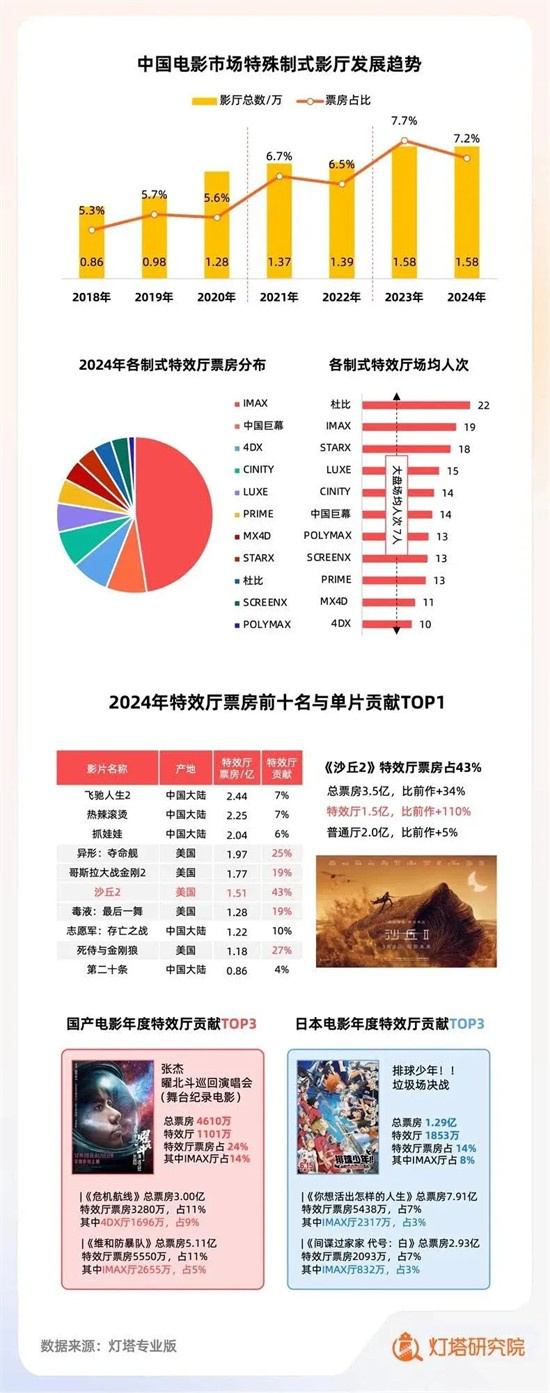 据灯塔报告,从2018年至2024年,特效厅数量保持逐年小幅攀升的趋势,特效厅的票房占比也保持稳定上升的势头。2023年特效厅的全年票房占比7.7%,为历年最高纪录。