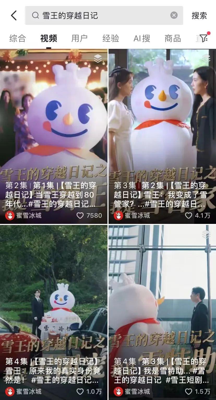 8月份,蜜雪冰城打造了首部定制短剧《雪王的穿越日记》,雪王以“雪舞王”“雪管家”“雪特助”“雪团宠”的身份穿越到不同情景中,把怀旧、商战、霸总、甜宠玩了个遍。