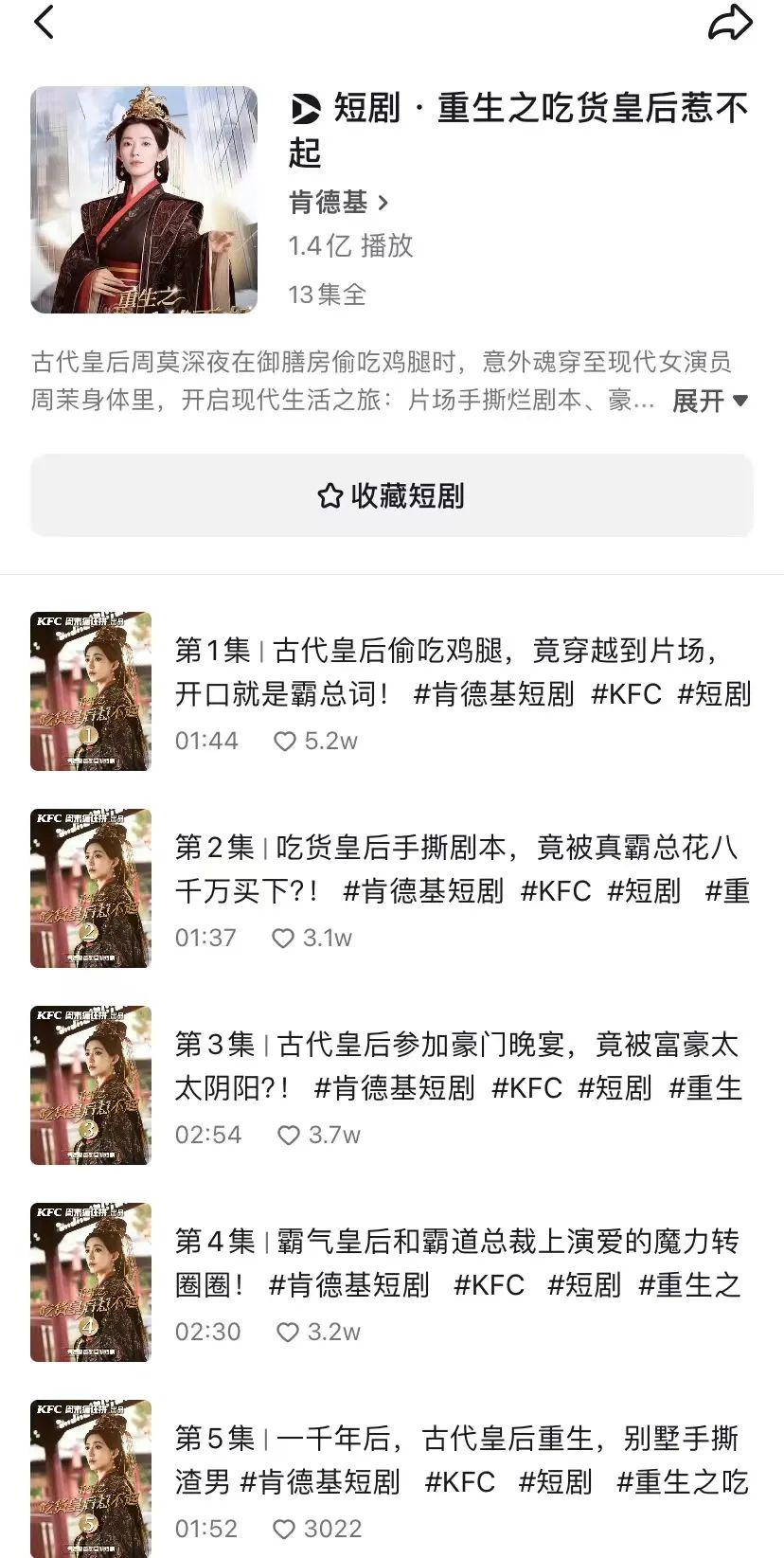 9月份,肯德基不甘落后上线首部定制短剧《重生之吃货皇后惹不起》,爱吃鸡腿的皇后在御膳房偷吃鸡腿魂穿到现代女演员身上,邂逅霸道总裁卷入商战,剧中植入了肯德基各种特色产品以及“KFC周末疯狂拼”活动,并在抖音斩获1.4亿播放量。