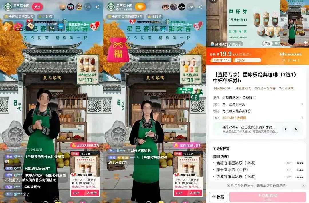 39.9文钱两杯咖啡、第二杯免费等促销活动,也与星巴克现实中的营销玩法形成了互文,在短剧播出期间,星巴克直播间以星巴客栈为背景,主播穿上剧中主角同款服饰,折扣也是一样,短剧流量无缝转接到直播间中。