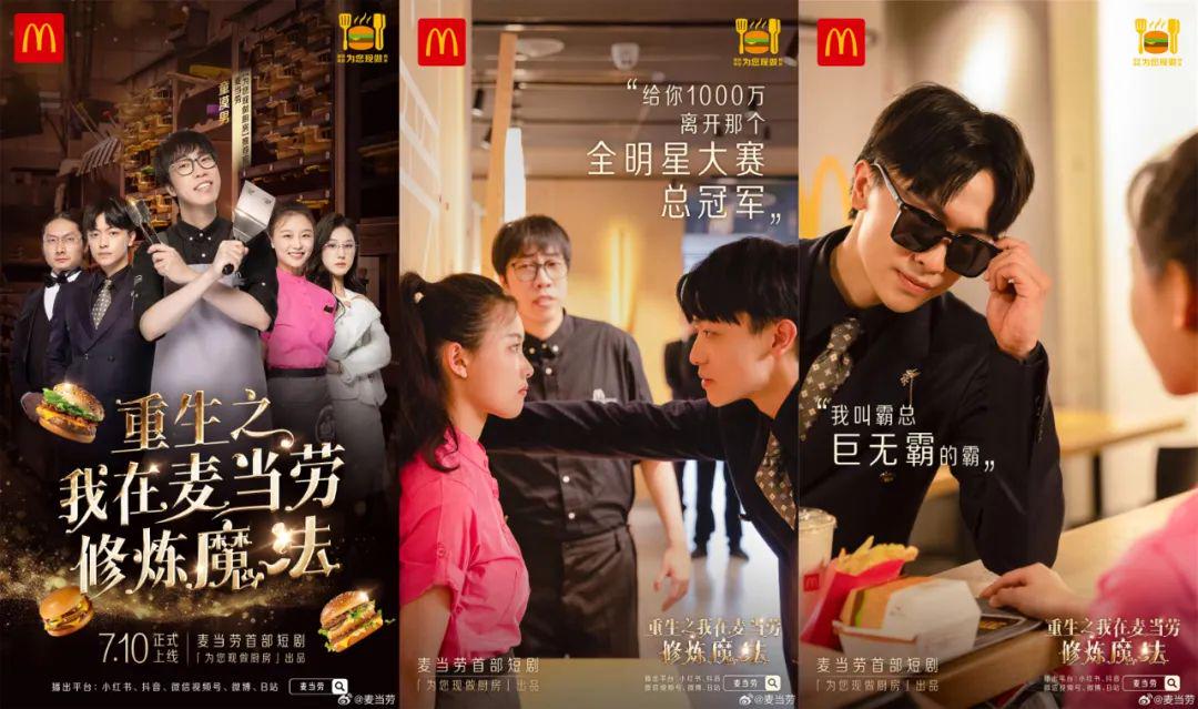 7月份,麦当劳率先推出首部定制短剧《重生之我在麦当劳修炼美味魔法》,脱口秀演员童漠男重生到麦当劳当员工,并卷入“霸氏集团”总裁“霸总”和麦当劳员工小麦的爱情故事中,每一集都展示了麦当劳的产品和理念。