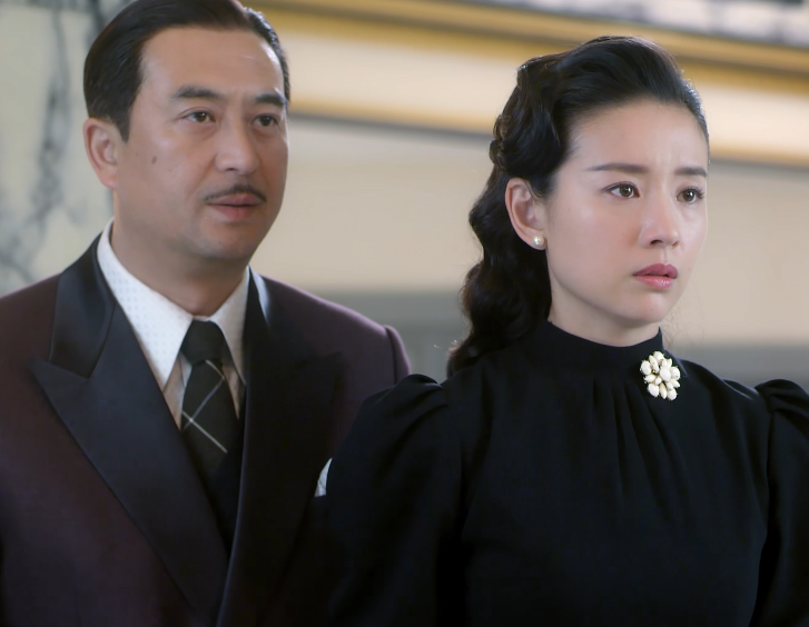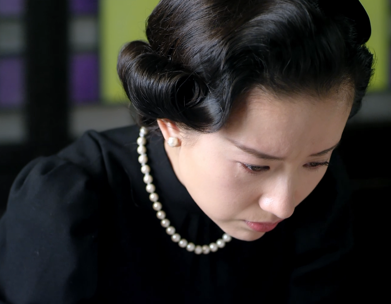 复古的发型,黑色裙装,脖颈处的珍珠项链将她的气质衬托的更加精致优雅,立体的五官在镜头中相当抢眼,只要稍微一皱眉,就能够让观众忍不住心疼。