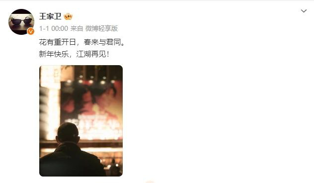 导演王家卫则在社交平台发文,花有重开日,春来与君同。新年快乐,江湖再见!配图则是其面朝大光明影城悬挂着的《花样年华》巨幅海报。