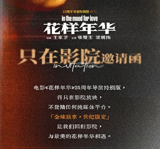 这部作为全球影迷公认的影史经典,导演王家卫更是宣布此版仅限影院,永不登陆流媒体。这一独家限定的概念,让这版《花样年华》更显珍贵。