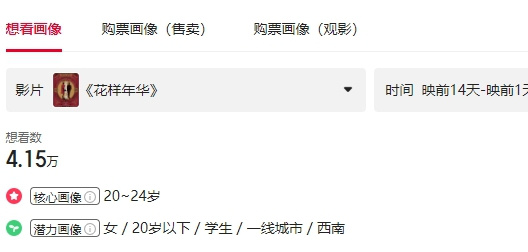 映前这一系列的宣传方式下,根据猫眼专业版显示《花样年华》的核心用户画像反而落在了20-24岁之间,即00后。同时,潜力用户则是生活在一线城市的05后。