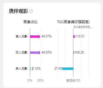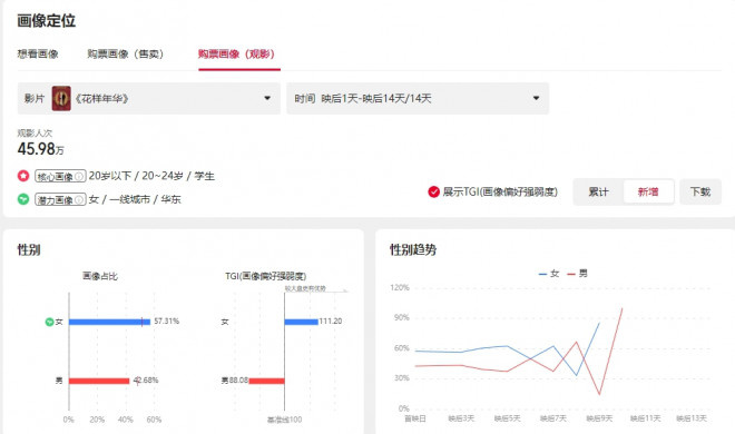 根据购票画像来看,《花样年华》的观众基本和想看用户吻合,但是比较意外的是,即便定档在情人节,该片在单人观影的画像方面占据了较高的优势。