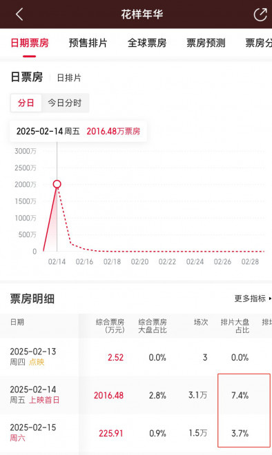 从这单一数据来看,该片后续或更适合通过长线放映实现票房增涨。不少影迷在网上表示,可以等过了情人节这天的情侣观影潮之后,再入场观众。除此之外,今年大学生主要回学校的时间为2月22日-24日,这一返校潮或也能为《花样年华》带来新的票房高点。